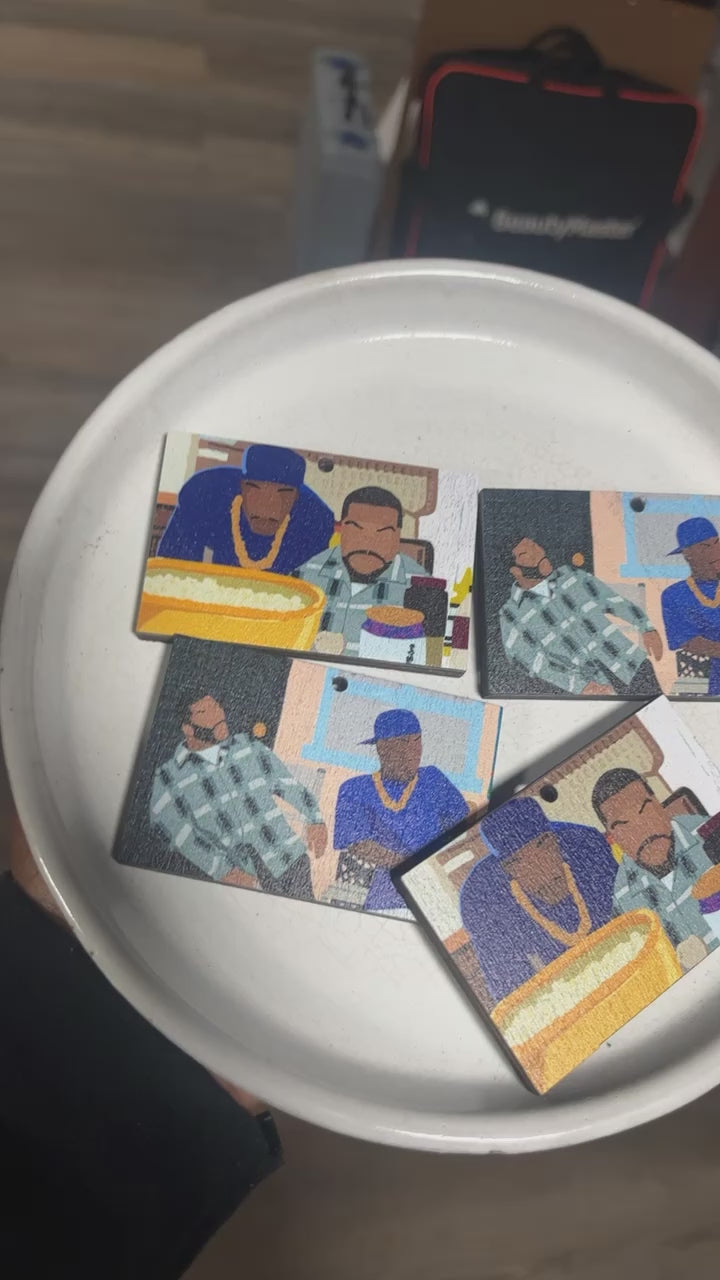 Bring the laughs, the nostalgia, and the attitude with out Friday Character earrings. A bold tribute to the cult classic "Friday" starring Ice Cube. These standout earrings feature digitally drawn scenes - from Smokey's hilarious expressions to Craig's unforgettable "Daaammm!" moment. Perfect for fans of 90's Hip-Hop culture and comedy, these earrings are more than accessories - they're a whole vibe. Wear them to rep your love for one of the most quotable movies of all time. Because around here, every day feels like Friday.