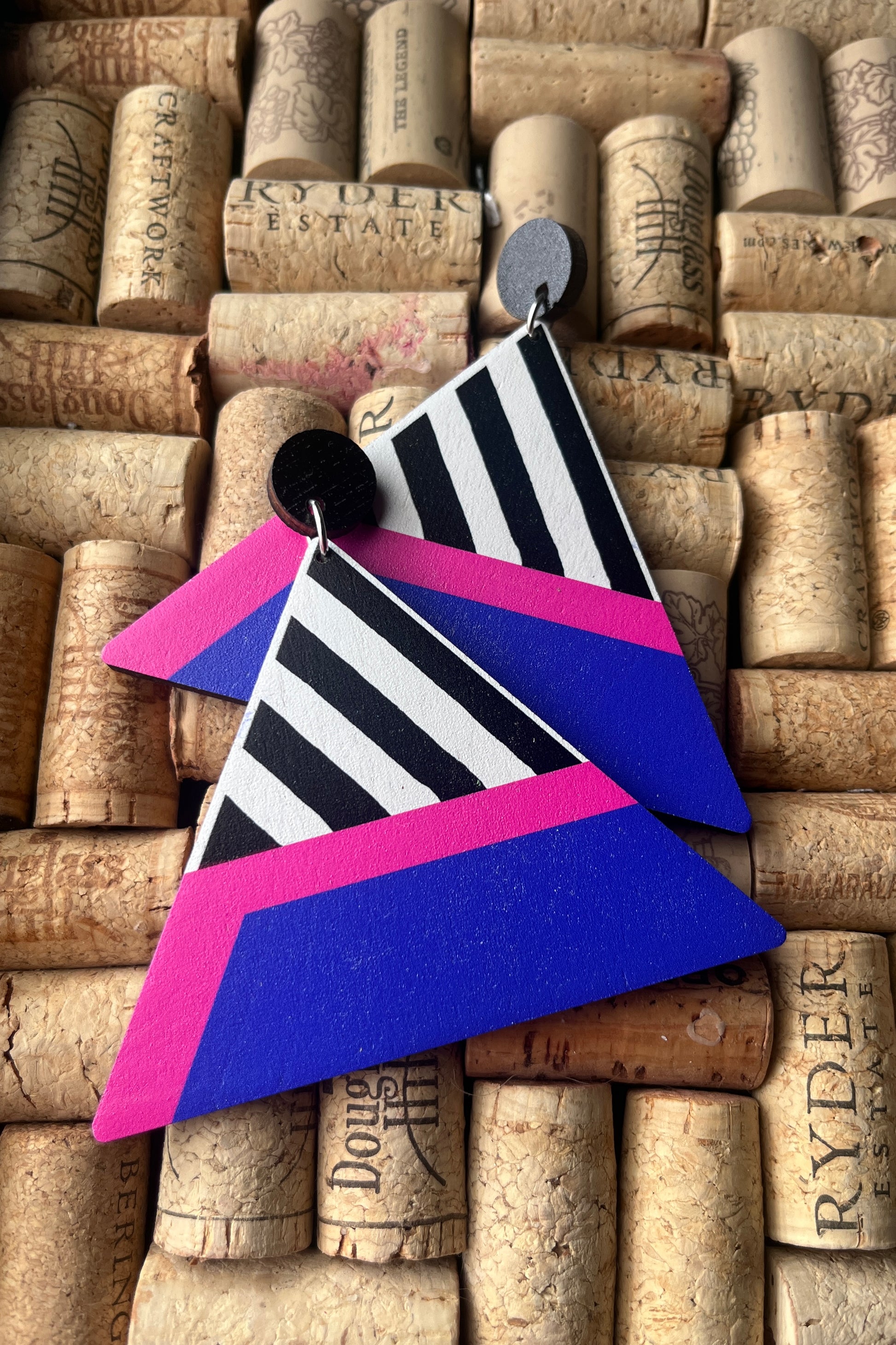 Loud, vibrant, and full of energy — Lindsey is here to steal the spotlight. These 4” x 3” wooden triangle earrings are a fearless fusion of deep purple and hot pink, accented with black and white stripes for a punch of graphic attitude.