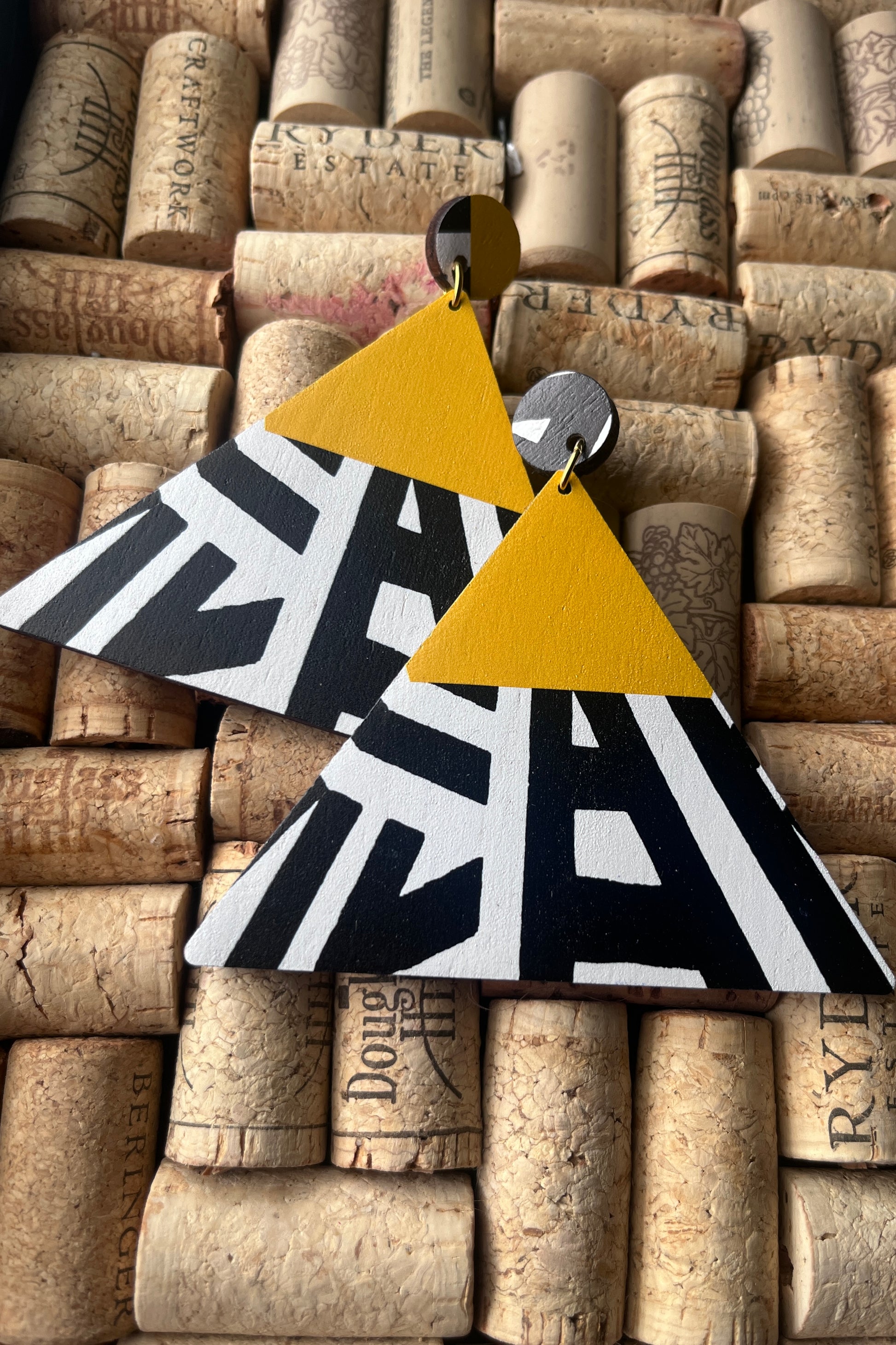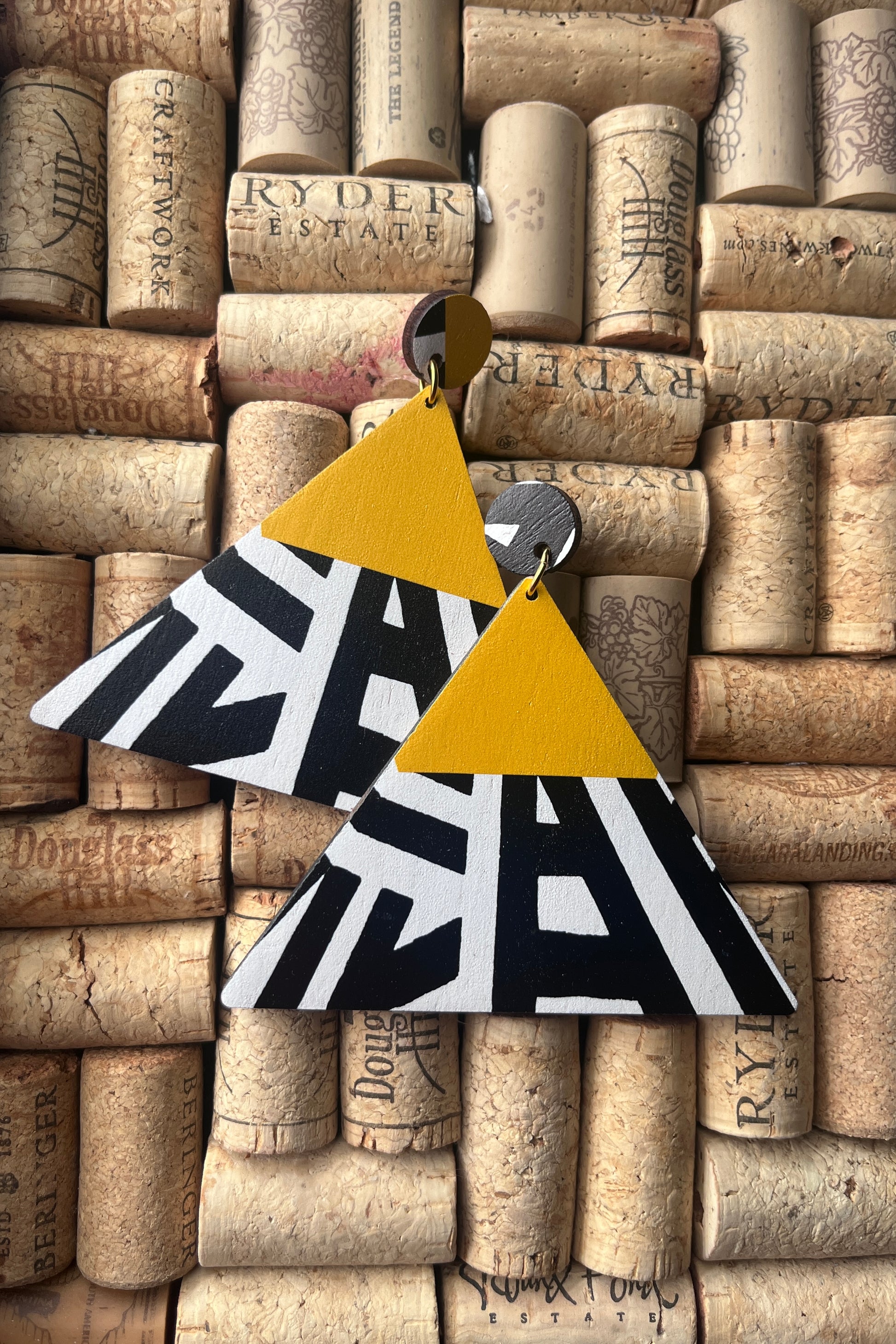 Make a striking statement with Tems; a bold triangle earring designed for those who lead with confidence and style. Measuring an eye-catching 4 inches by 3 inches, Tems pairs sharp geometry with contrasting textures to create a look that’s both modern and unapologetically artistic.